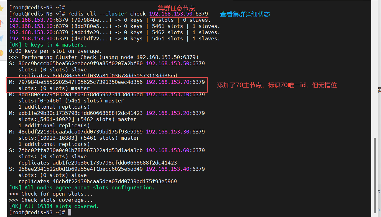 [root@redis-N2 ~]# redis-cli --cluster check 192.168.153.70:6379
