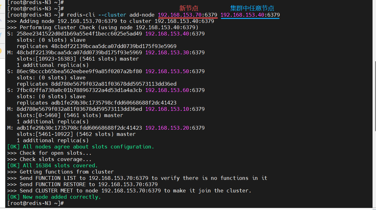 [root@redis-N3 ~]# redis-cli --cluster add-node 192.168.153.70:6379 192.168.153.40:6379
