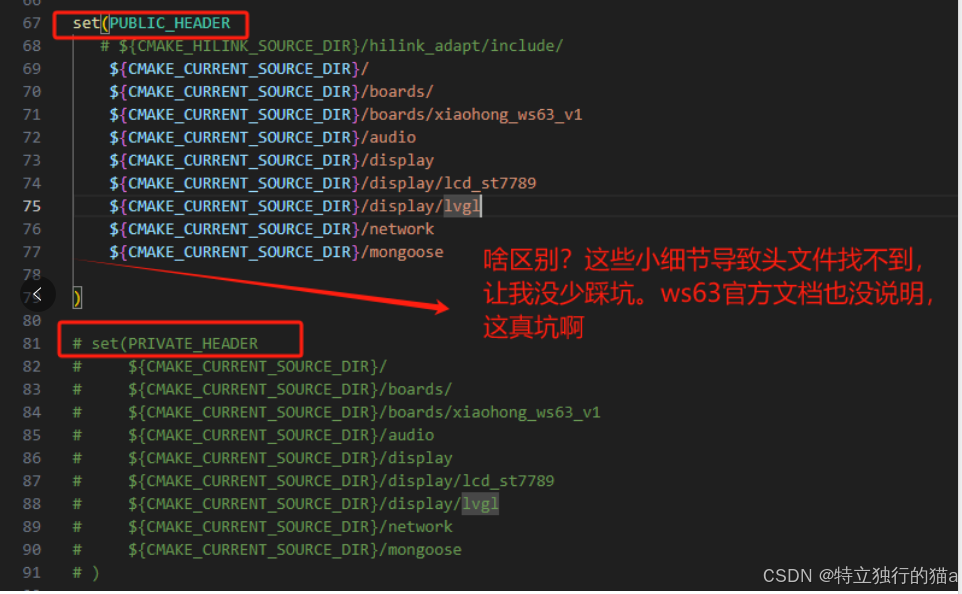 该报错原因是,没有搞明白PUBLIC和PRIVATE_HREADER的区别。这部分官方文档惜墨如金,没有详述。因为某些头文件需要被外部模块引用,如果都定义为PRIVATE_HREADER,则外部组件则可能报找不到头文件的错误。PRIVATE_HEADER则指定私有头文件路径,仅当前组件内部使用。