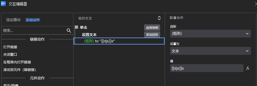 选中【状态1】的元件,添加【单击】事件,动作【设置文本】目标为状态2的元件,文件值【[[djs]]s】