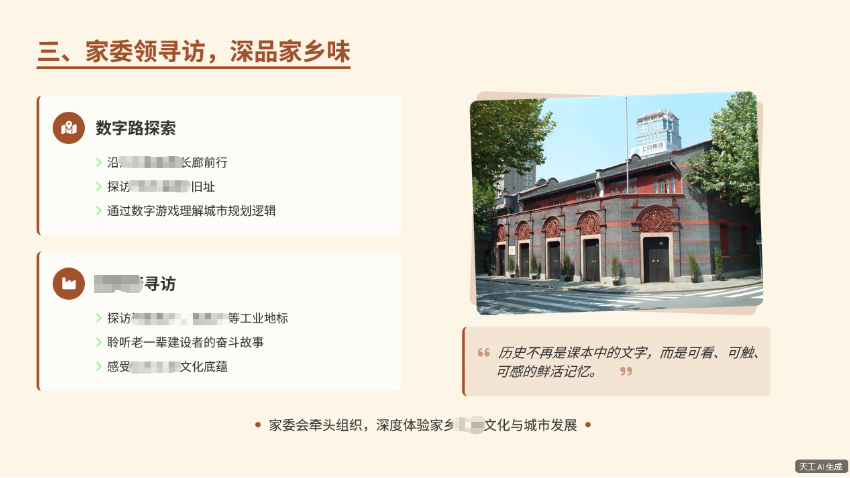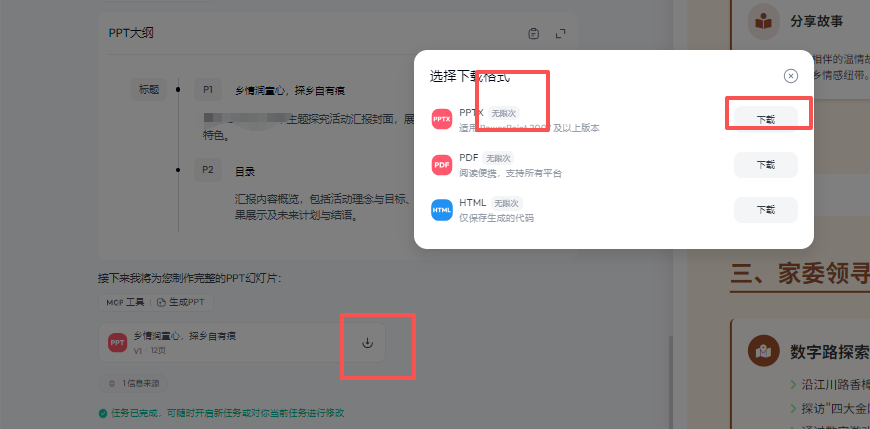 在"天工AI"打开"新的,我把最后一稿PPT大纲文字贴入。附件抄送本次"主持稿+汇报稿.DOCX"