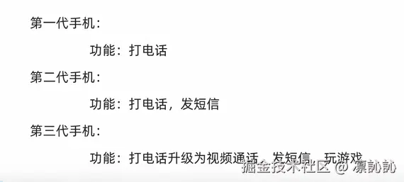 下图中: 由第二代跃迁到第三代手机中,打电话升级了视频通话; 方法不能满足子类的要求 了,需要**重写; **