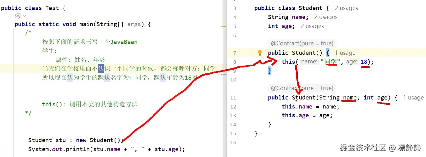 - 创建对象调用空参构造,空参构造通过this()调用本类的有参构造、给成员变量赋值;