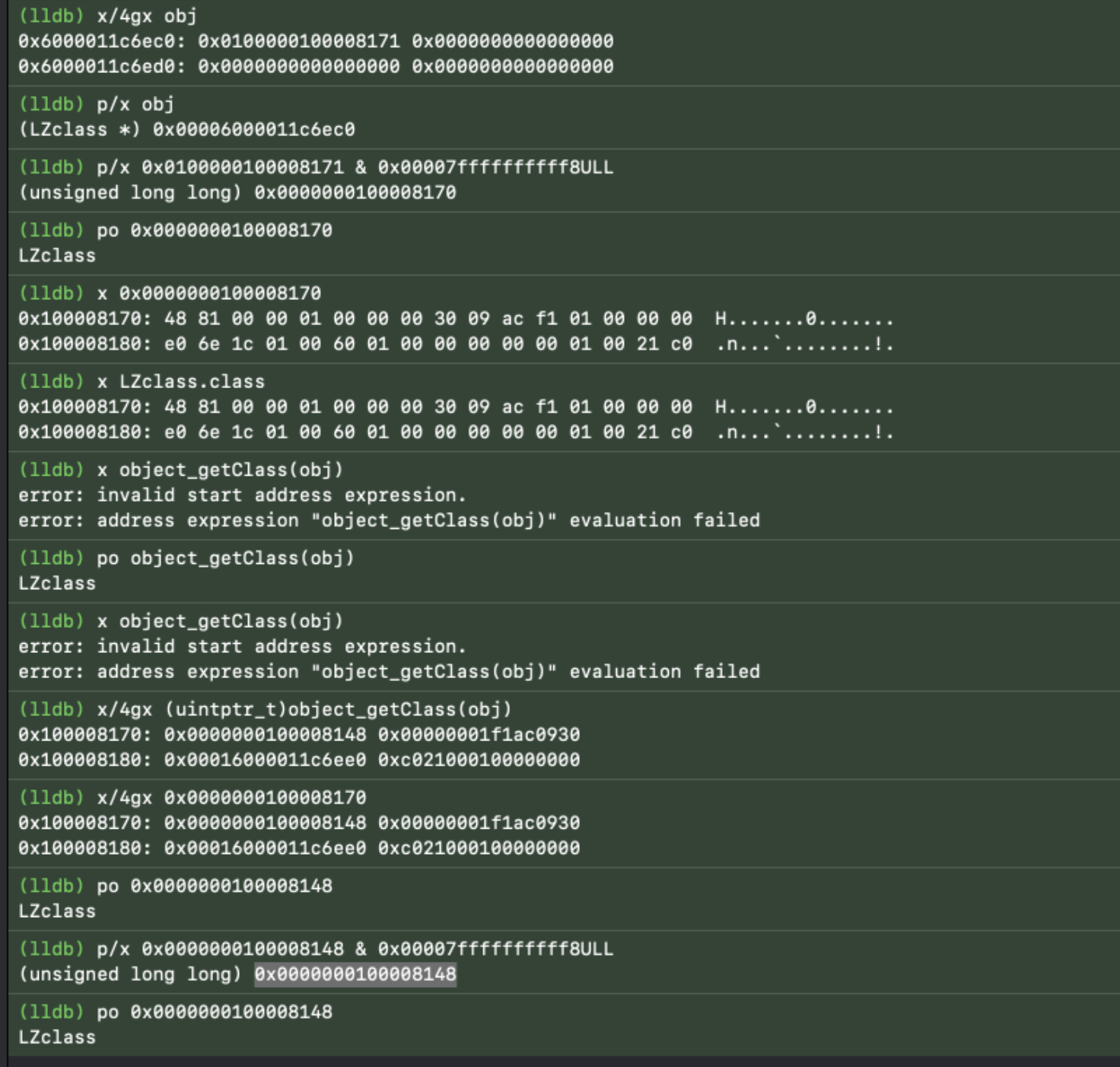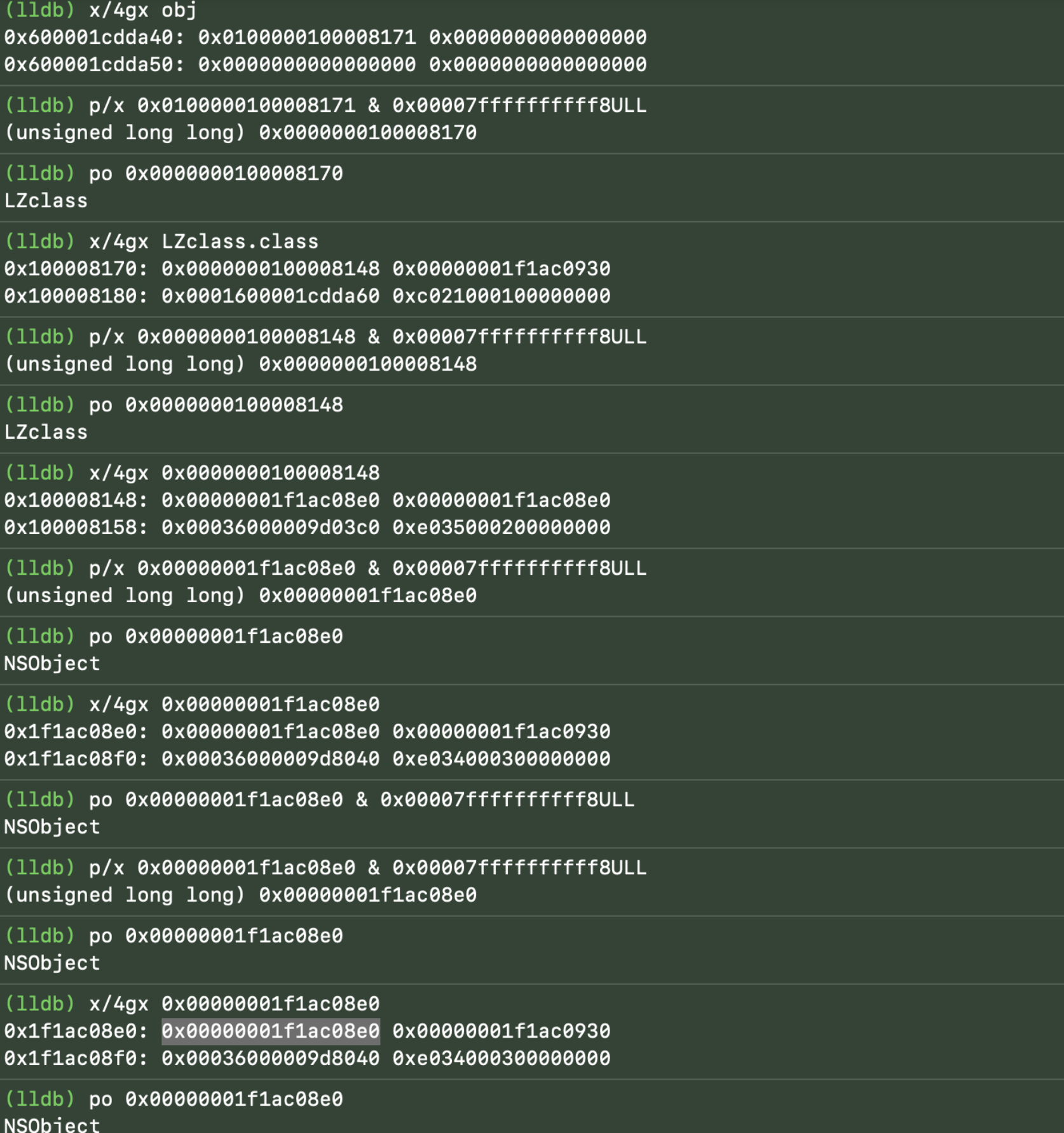 NSObject_IVARS的地址、CGObject的地址、NSObject_IVARS的地址完全相同.因为isa永远在内存偏移量为0的位置,所以无论对象实际是哪一个子类,运行时只要将对象指针强转换为NSObject*并读取第一个字节,就能正确获取isa指针,识别类型。