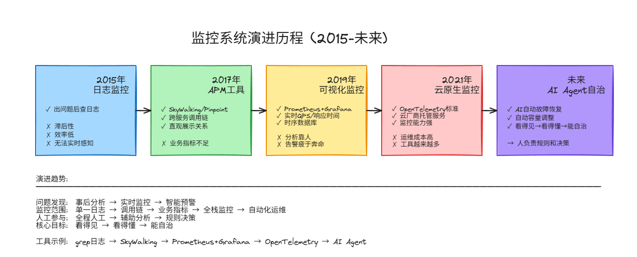 | 云原生监控 (2020s) | 工具太多,运维成本高 (Prometheus、Grafana、Jaeger...) | 仍然需要人工 (工具统一了,但半夜还是要起来扩容) |