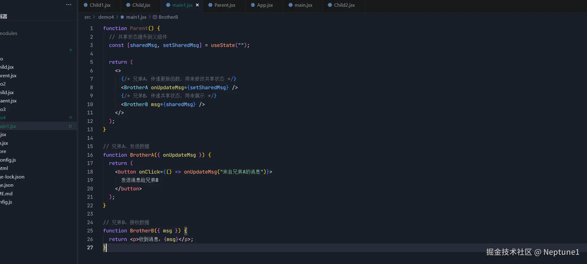 1.什么是兄弟组件以及什么什么是状态提升 在 React 组件开发中,兄弟组件是指拥有同一个直接 / 间接父组件、但互相之间没有直接引用关系的同级组件。由于 React 组件的内部状态是私有隔离的,兄弟组件无法直接访问对方的 state、props 或实例方法,而状态提升(State Lifting) 正是 React 官方推荐的、解决兄弟组件通讯的原生标准方案,完全契合 React 单向数据流的核心设计理念。