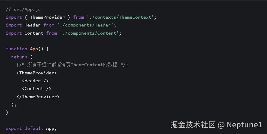 在顶层组件(如APP.js)中挂载Provider,让后代组件能够访问主题数据