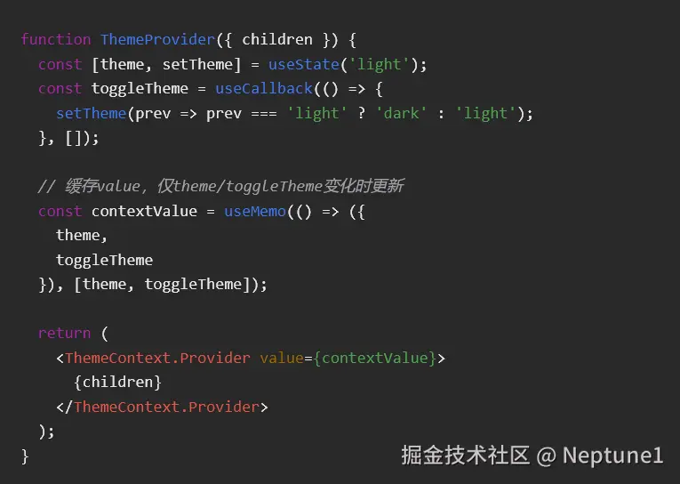 每次父组件渲染时,直接写在Provider里的对象会被重新渲染,导致 value引用发生变化。用useMemo 缓存 value ,仅依赖项变更时才会更新,避免无效的重新渲染