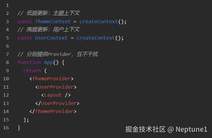 不要把所有共享状态塞到一个大的 Context里,根据数据更新频率、业务关联性拆分成多个小的Context。比如低频更新的主题和语言拆成一个,高频更新的用户信息、购物车等内容拆成独立的Context。