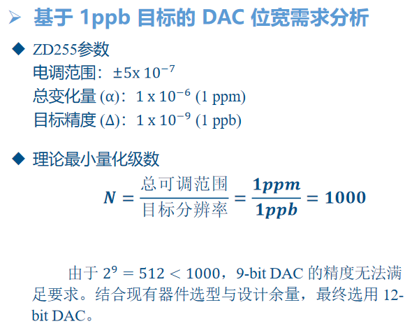 该方法将晶振的总电调范围(Tuning Range)看作一段总长度,将你期望达到的频率步进(如 1ppb)看作最小刻度,计算出覆盖这段长度最少需要多少个"台阶"。