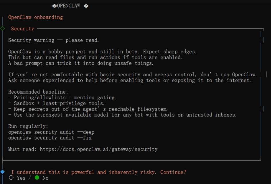 I understand this is personal-by-default and shared/multi-user use requires lock-down. Continue? (我明白这是默认的个人使用,共享/多用户使用需要锁定。要继续吗?)