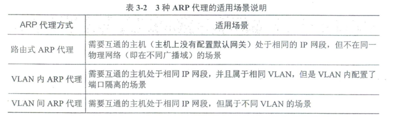 ARP代理分为路由式ARP代理、VLAN内ARP代理和VLAN间ARP代理,它们各自的适用场景见表3-2。HCIA只需掌握路由式代理ARP原理即可。
