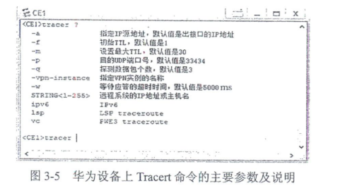 在图3 - 5中的参数中,-f是初始TTL值(默认为1),表示第一次发送ICMP测试包(每一次会同时发送多个ICMP测试包,华为设备默认一次发送3个)时的TTL值为1,即只能从源端传输到下一跳设备,再传会超时,会返回ICMP Echo应答消息,以表明数据包到达了对应跳设备。随后,第二次发送ICMP测试包时,TTL值会增加1,即等于2,第三次发送ICMP测试包时,TTL值再增加1,以此类推。最多发送多少次ICMP测试包,一是要看从源端到达目的端所经过的三层设备跳数,二是要看 - m参数(最大TTL)的设备(华为设备的默认值为30)。当从源端到达目的端所经过的跳数小于默认的最大TTL值时,最多只发送对应跳数次ICMP数据包。