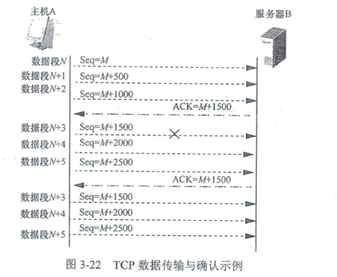 如图3 - 22所示,假设主机A向服务器B发送的第N个数据段的序列号为M,每个数据段中Data部分的长度均为500个字节,即每个数据段的序列号在其前一个数据段的序列号基础上要加500。如第N + 1个数据段的序列号为M + 500,第N + 2个数据段的序列号为M + 1000,第N + 3个数据段的序列号为M + 1500,第N + 4个数据段的序列号为M + 2000......
