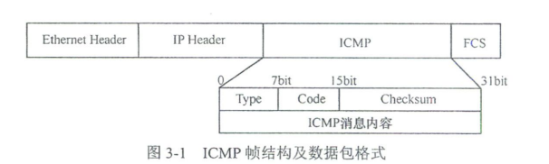 ICMP与IPv4协议同位于网络层,但它的子层次高于IPv4协议,所以ICMP数据包发送时需要经过IPv4协议的封装(如果IPv4数据包中是ICMP消息,则IPv4数据包头中的Protocol字段值为1),到了以太网数据链路层后,还要经过以太网协议封装。其整体封装结构如图3 - 1所示,其中ICMP数据包作为IPv4数据包中的Data部分,包括以下4个字段。