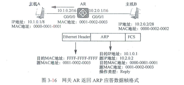 ② 启用路由式ARP代理功能后,AR在收到主机A发送的ARP请求数据包后查找本地路由表。由于主机B与AR直连,AR上存有主机B的路由表项,所以认为可以直接进行ARP应答(如果与目的主机不是直连的,则AR也不能直接通过一个ARP请求数据包获取到目的主机的MAC地址)。AR使用自己的G0/0/0接口(是主机A的网关,但其实在主机A上并没有配置该网关,一定要注意)的MAC地址给主机A发送ARP应答数据包,ARP应答数据包中的源IPv4地址仍为目的主机B的IPv4地址,具体帧格式如图3 - 16所示。从中可以看出,在ARP应答数据包中,源IPv4地址是主机B的,但源MAC地址却是G0/0/0接口的MAC地址,这就是通常所说的"善意的欺骗"。