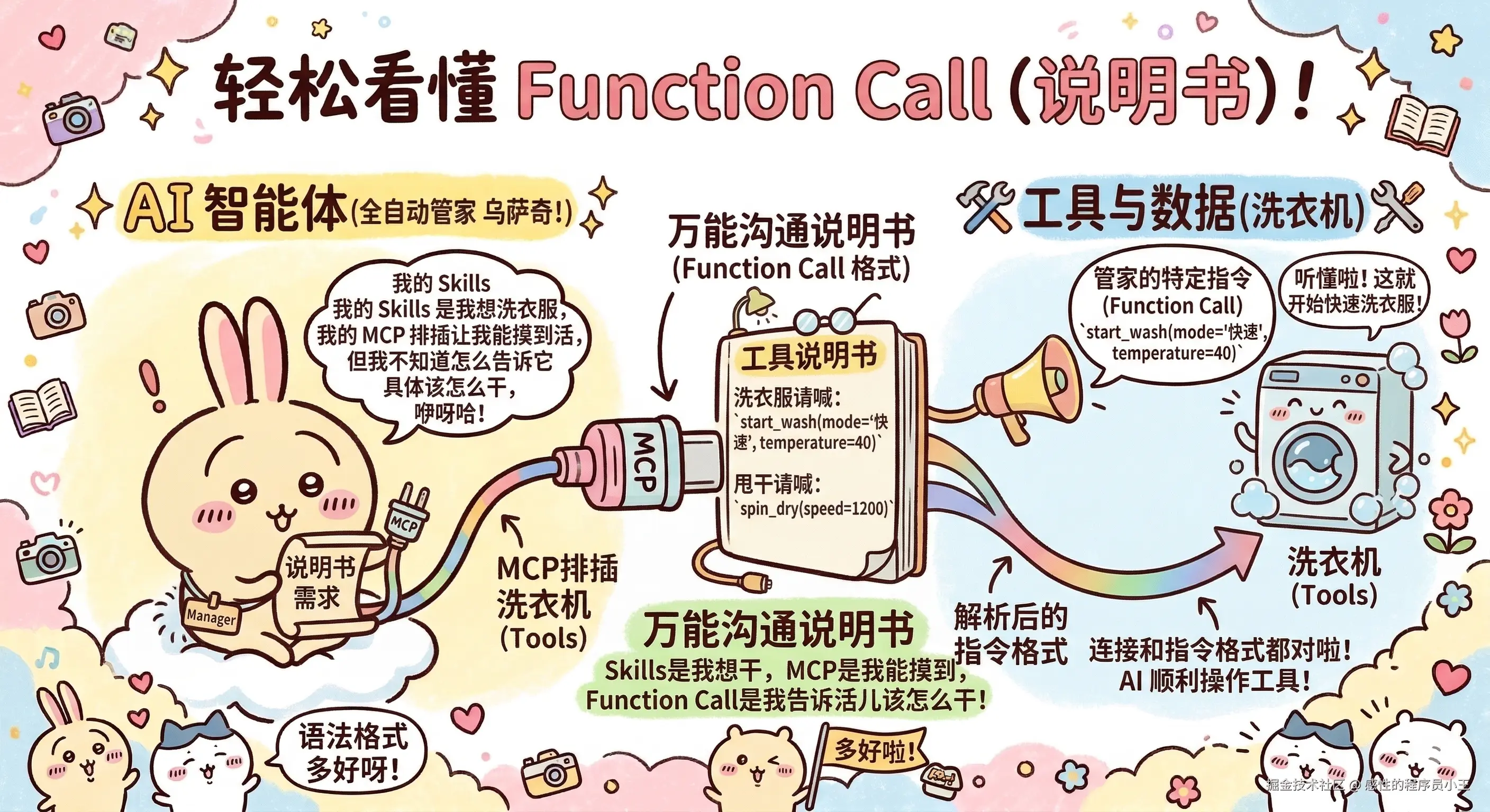 - Function Call (沟通语法) :解决 "怎么说"。它是 AI 调用工具时必须遵守的特定代码格式(说明书)。