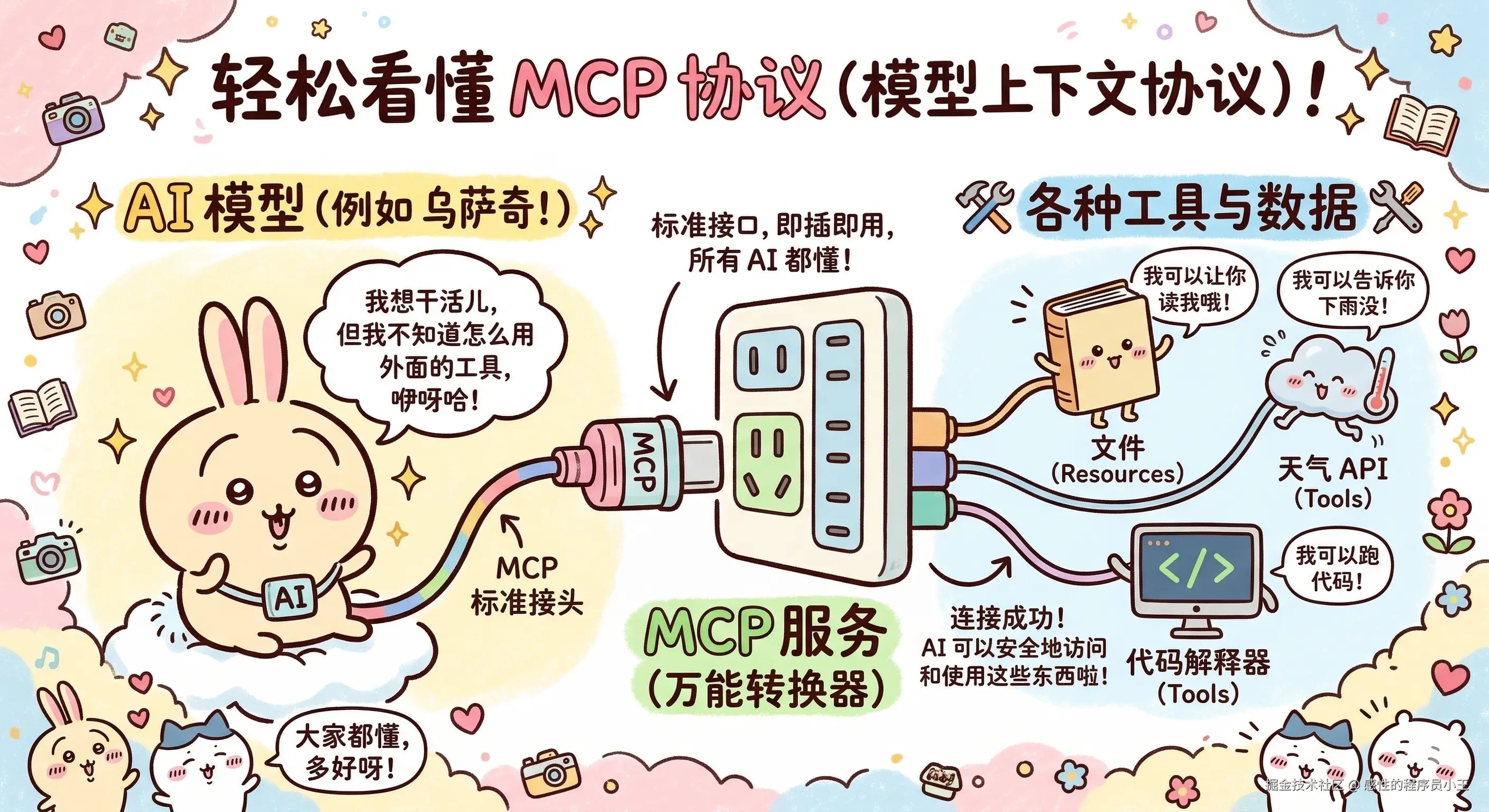 - MCP (接口标准) :解决 "怎么连"。它是万能插座,让 AI 能摸到外部的数据和工具。