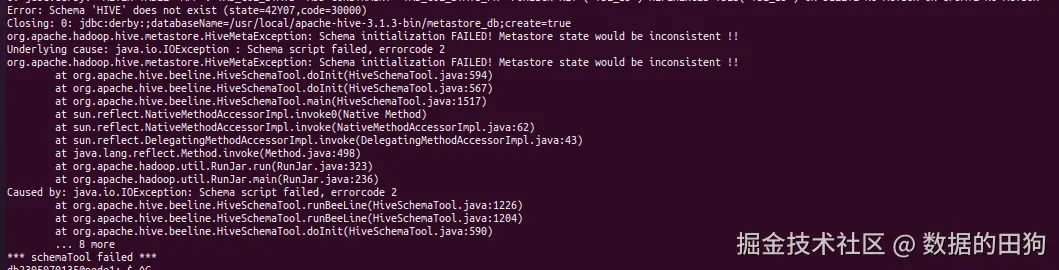 - 【Derby 场景: Derby 是轻量级嵌入式数据库,没有「独立 Schema」的概念 ------ 它只有「用户」的概念,默认把所有表创建在内置的 APP 用户下,而非 HIVE Schema。但 schematool 不管数据库类型,一律执行 SELECT * FROM "HIVE"."VERSION" 检查,自然找不到,就抛出「Schema 'HIVE' does not exist」的误报。】