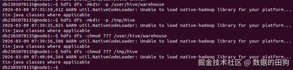 # 在 HDFS 上创建 Hive 所需目录(存储元数据、临时文件):
