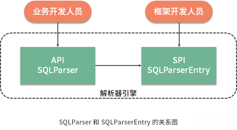 从定位上讲,SQLParser 是解析器对外暴露的入口,而 SQLParserEntry 是解析器的底层实现,两者共同构成了 SQL 解析器本身。更宽泛的,从架构设计层次上讲,API 面向高层业务开发人员,而 SPI 面向底层框架开发人员,两者的关系如下图所示。作为一款优秀的中间件框架,这种 API 和 SPI 的对应关系在 ShardingSphere 中非常普遍,也是我们正确理解 ShardingSphere 架构设计上的一个切入点。