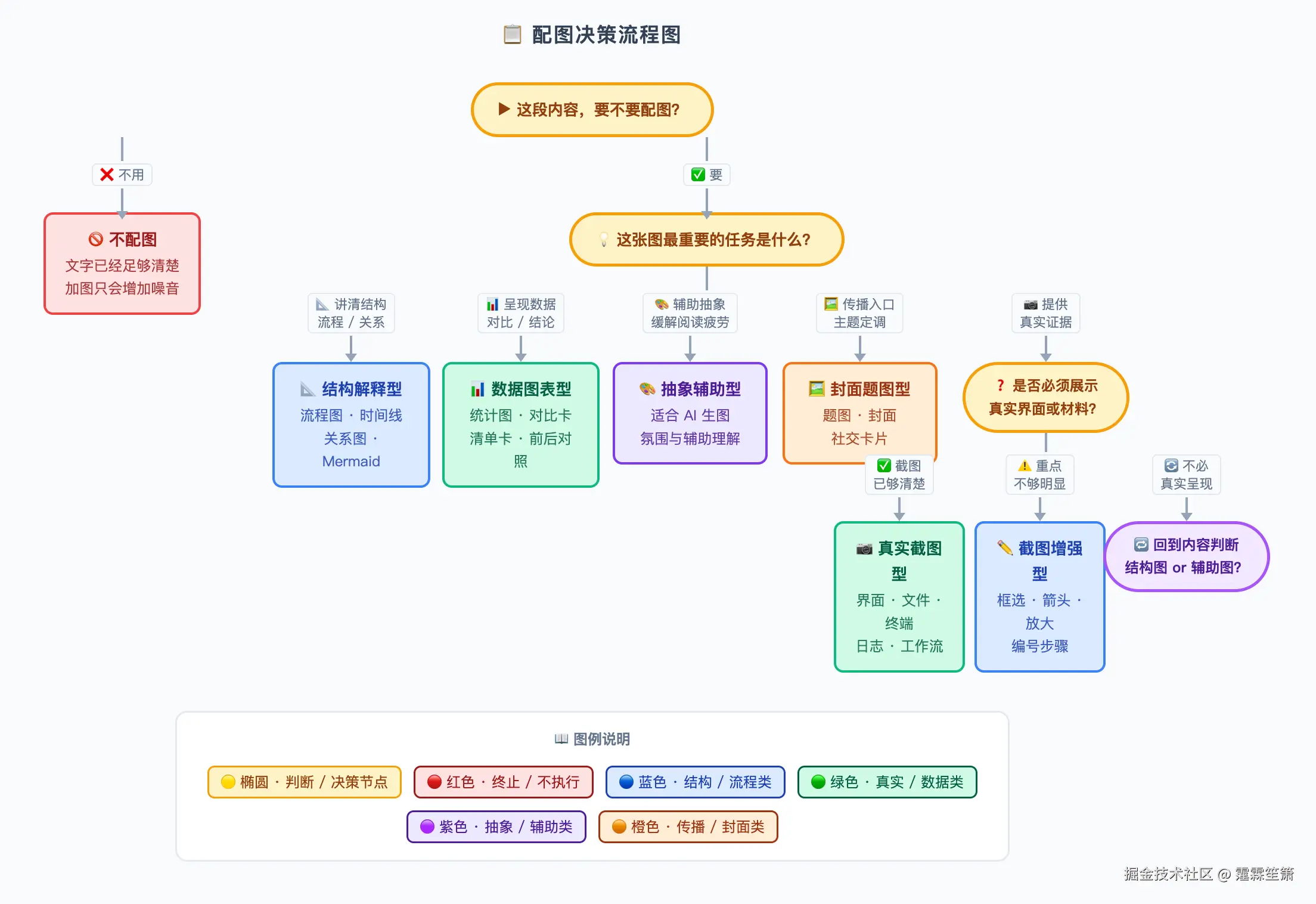 也就是说,文章配图这件事,根本不是"帮我多出几张图",而是先判断:这里值不值得配图、这张图是拿来解释还是证明、该由 AI 生成还是作者亲自处理。
