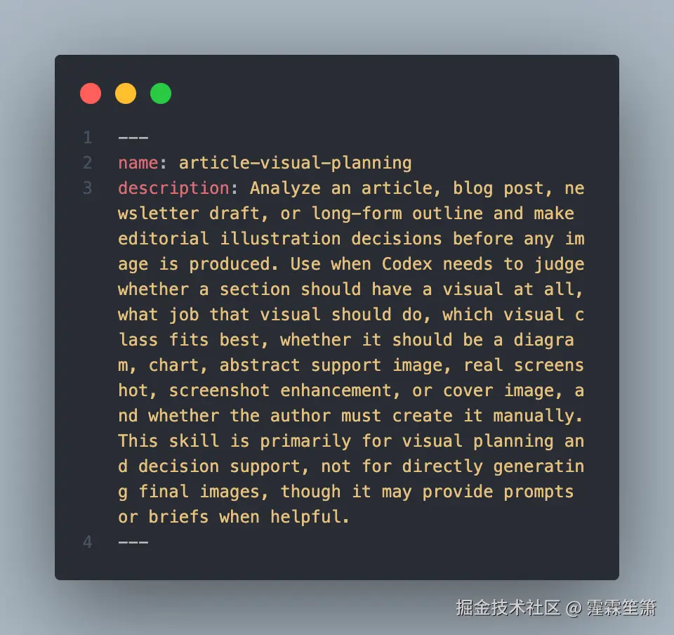 尤其是 name 和 description,它们几乎决定了这个 skill 会不会被正确理解、会不会在对的时候触发。