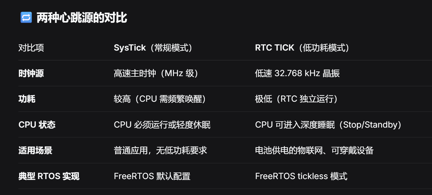 等到 RTC 闹钟触发,CPU 被唤醒,RTOS 再根据实际经过的时间"补"滴答数,继续正常运行。