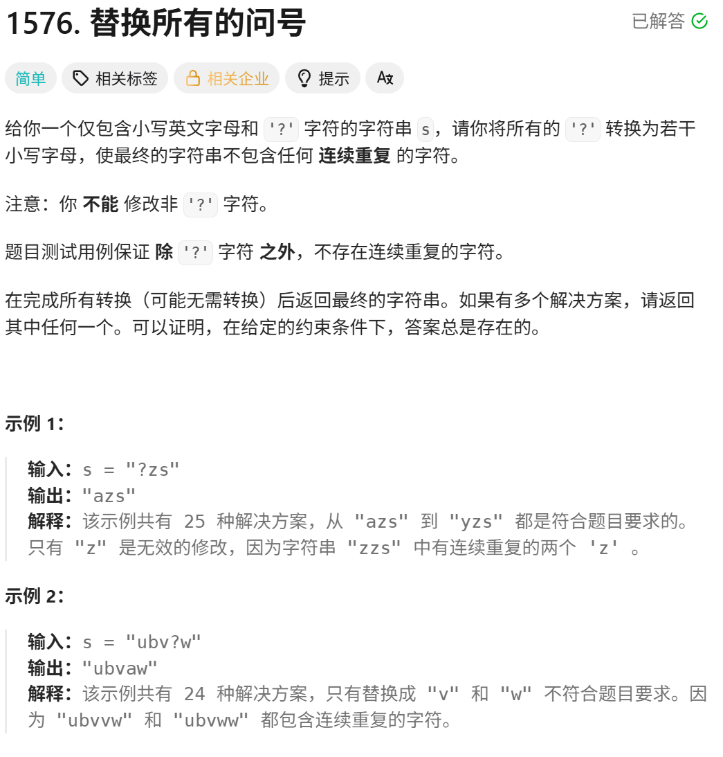 遍历数组找到string里面的'?'替换即可,考验的是代码编写的能力