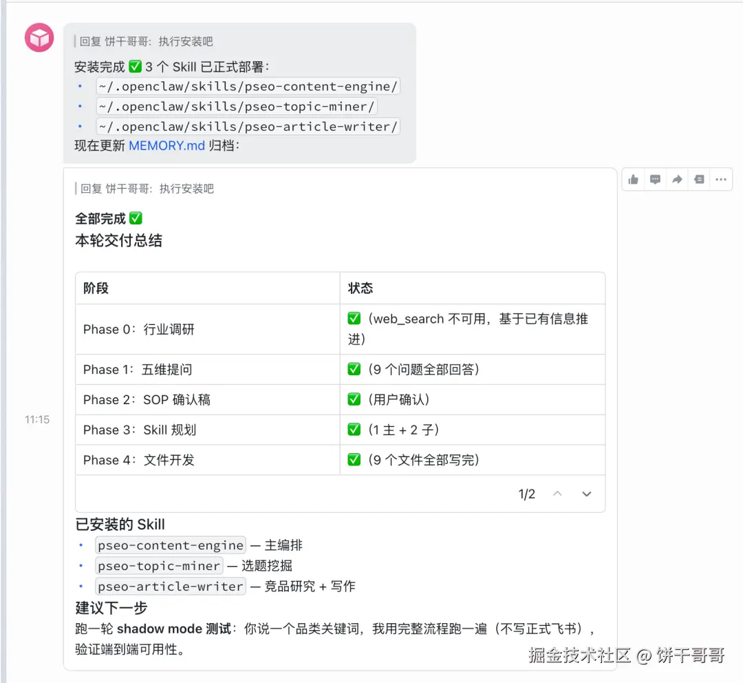 它跑了九个问题的五维问答,整理出 SOP 确认稿,我确认之后它规划出「1 主 + 2 子」的三个 Skill 方案,然后顺序开发,9 个文件全部生成,自测三个评测用例全通过,安全审计五项全绿,安装完成,更新 MEMORY.md 归档。