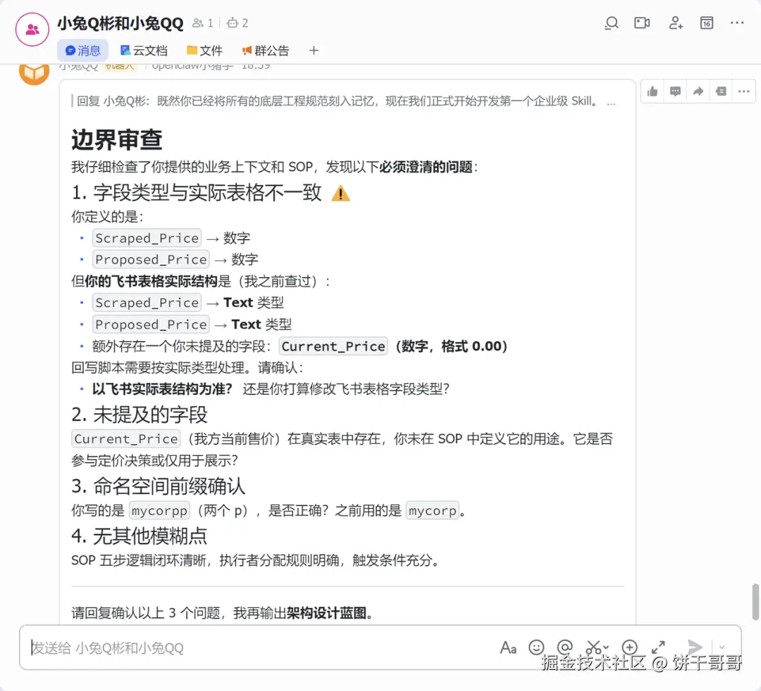 模型收到提示词后,没有直接动手,而是先审查 SOP,发现了三个问题:字段类型与实际表格不一致、有个未提及的字段 Current_Price 用途不明、命名空间前缀写错了。