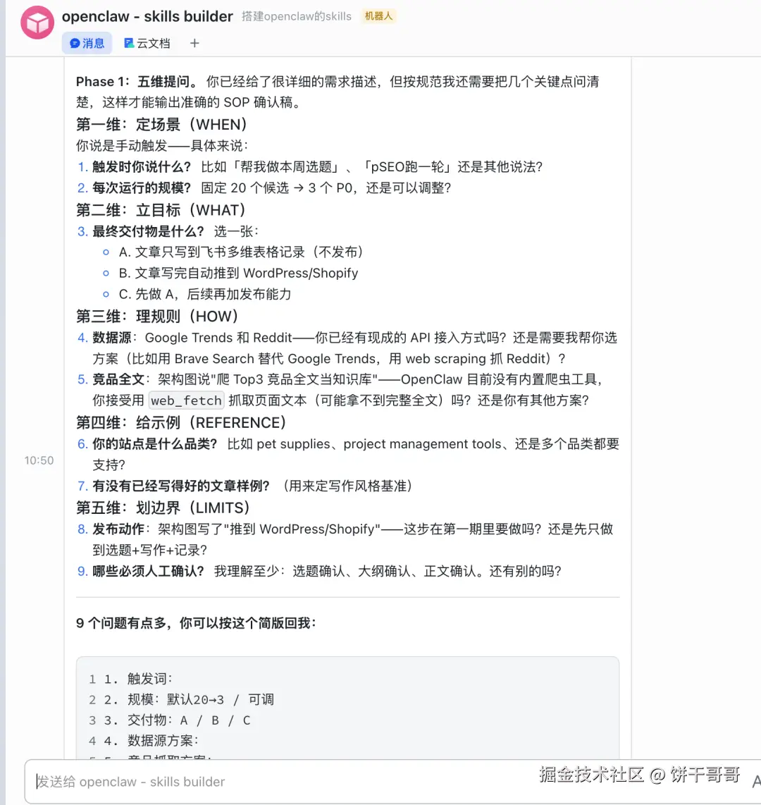 你发一张业务流程图,说「我想把这个场景做成 Skill」。Agent 先去搜索行业最佳实践,然后用五维提问框架问你业务细节,整理出 SOP 确认稿让你确认,规划 Skill 方案,你决定先开发哪个,它进入开发模式,生成完整的 Skill 文件结构,自测,安全审计,安装到正式目录,记入长期记忆。