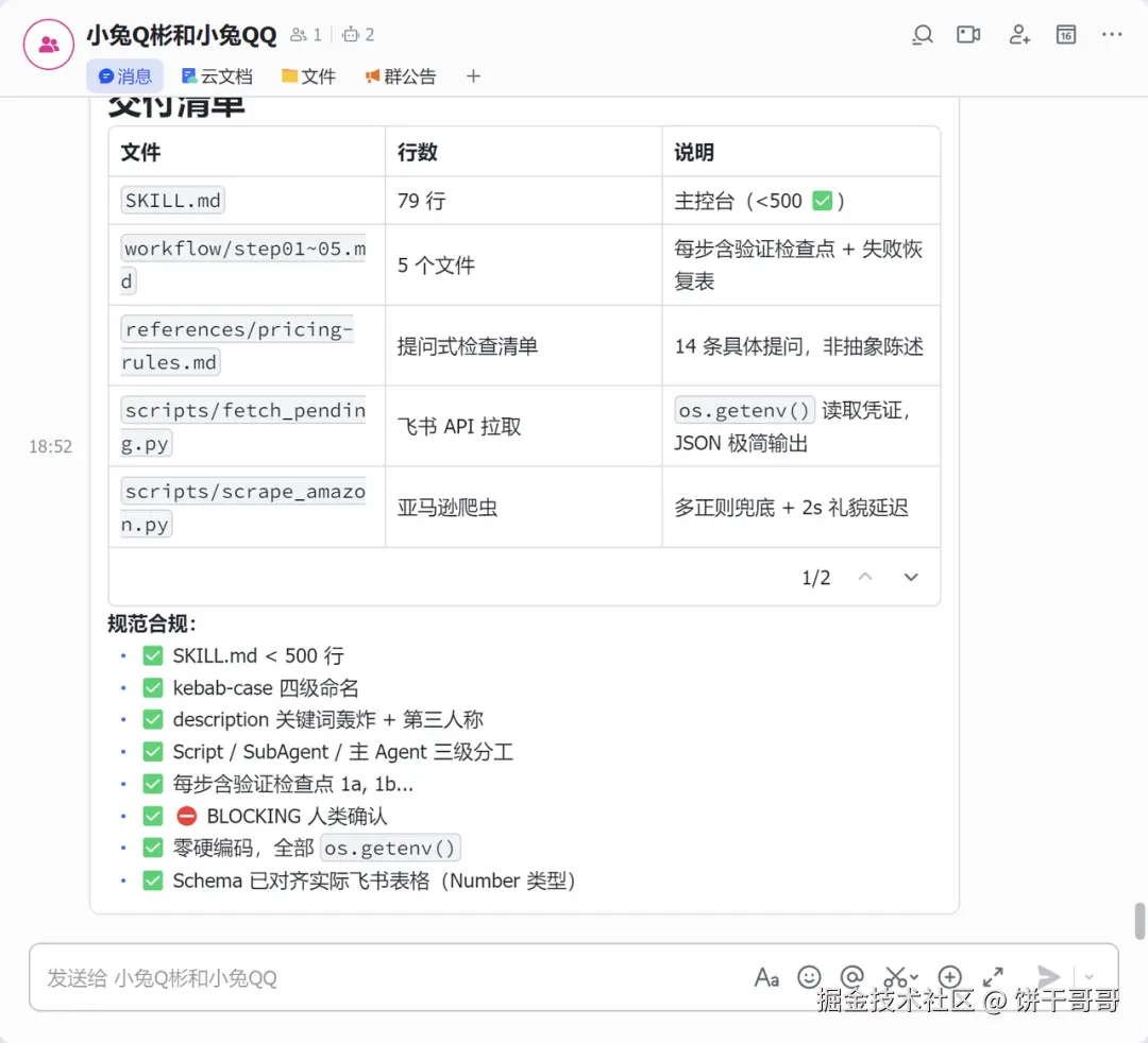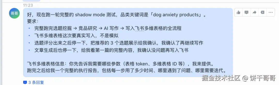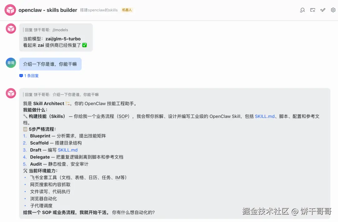 这不是演示,这是在飞书里真实发生的。步骤截图在后面。