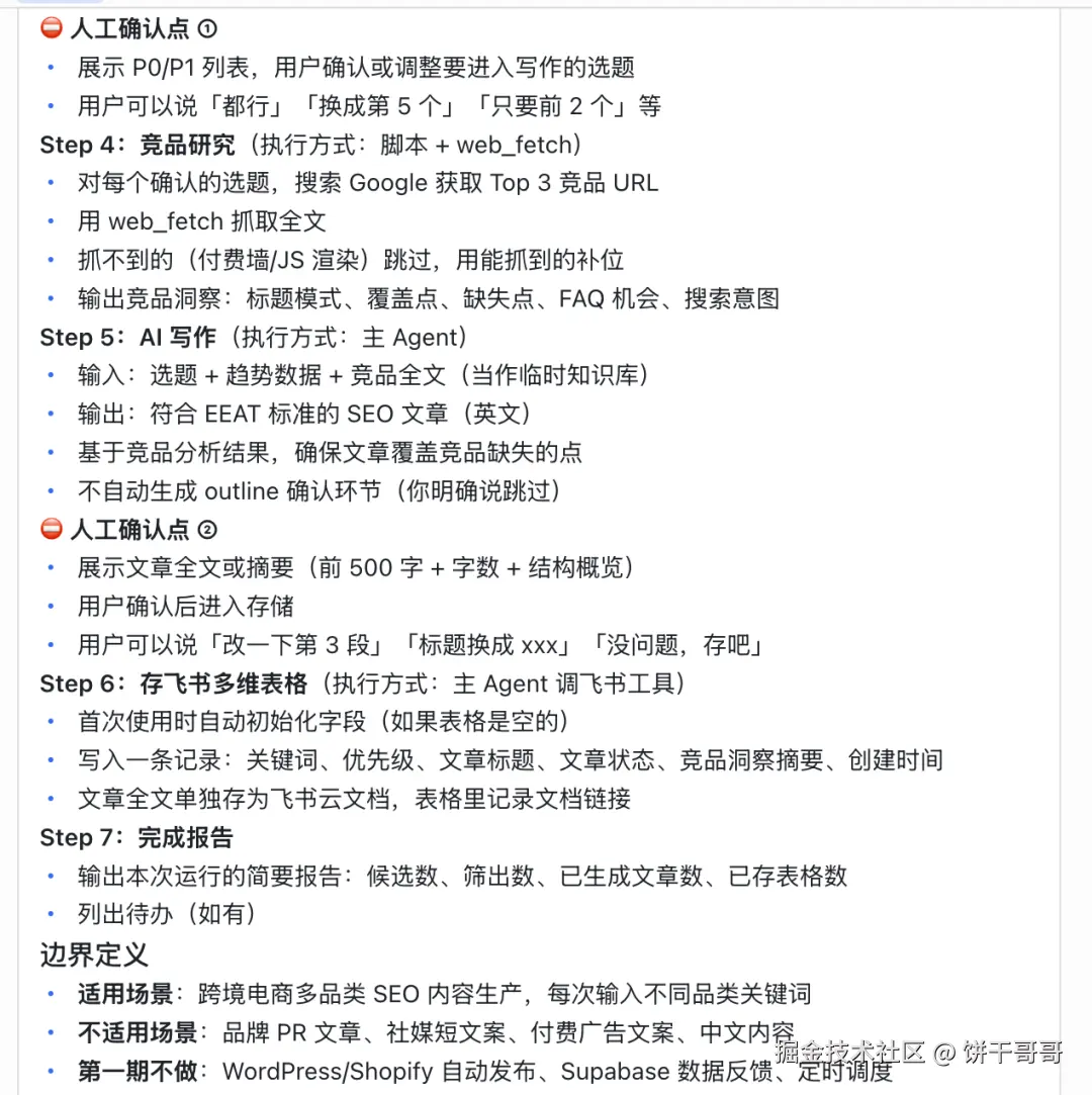 五个维度问完,Skill 会整理出 SOP 确认稿让你确认,梳理得非常细:
