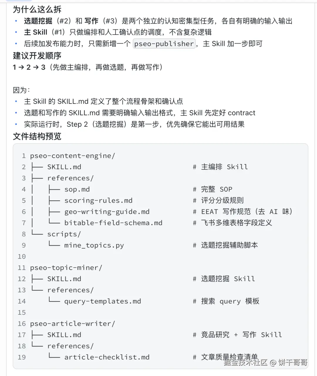 再输出 Skill 规划方案------这个场景要拆几个 Skill、每个 Skill 职责是什么、建议开发顺序。复杂任务就是需要这样多skills协作。