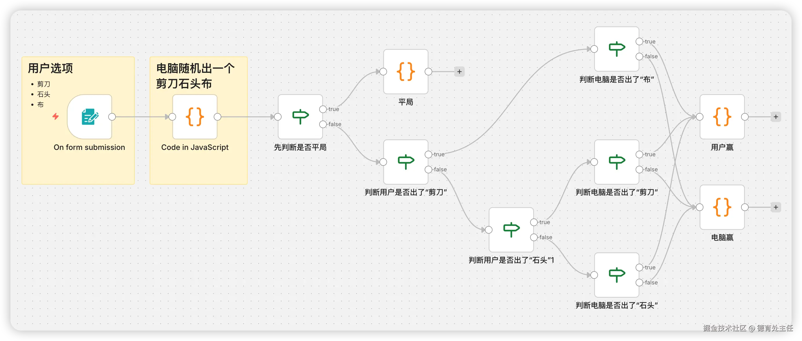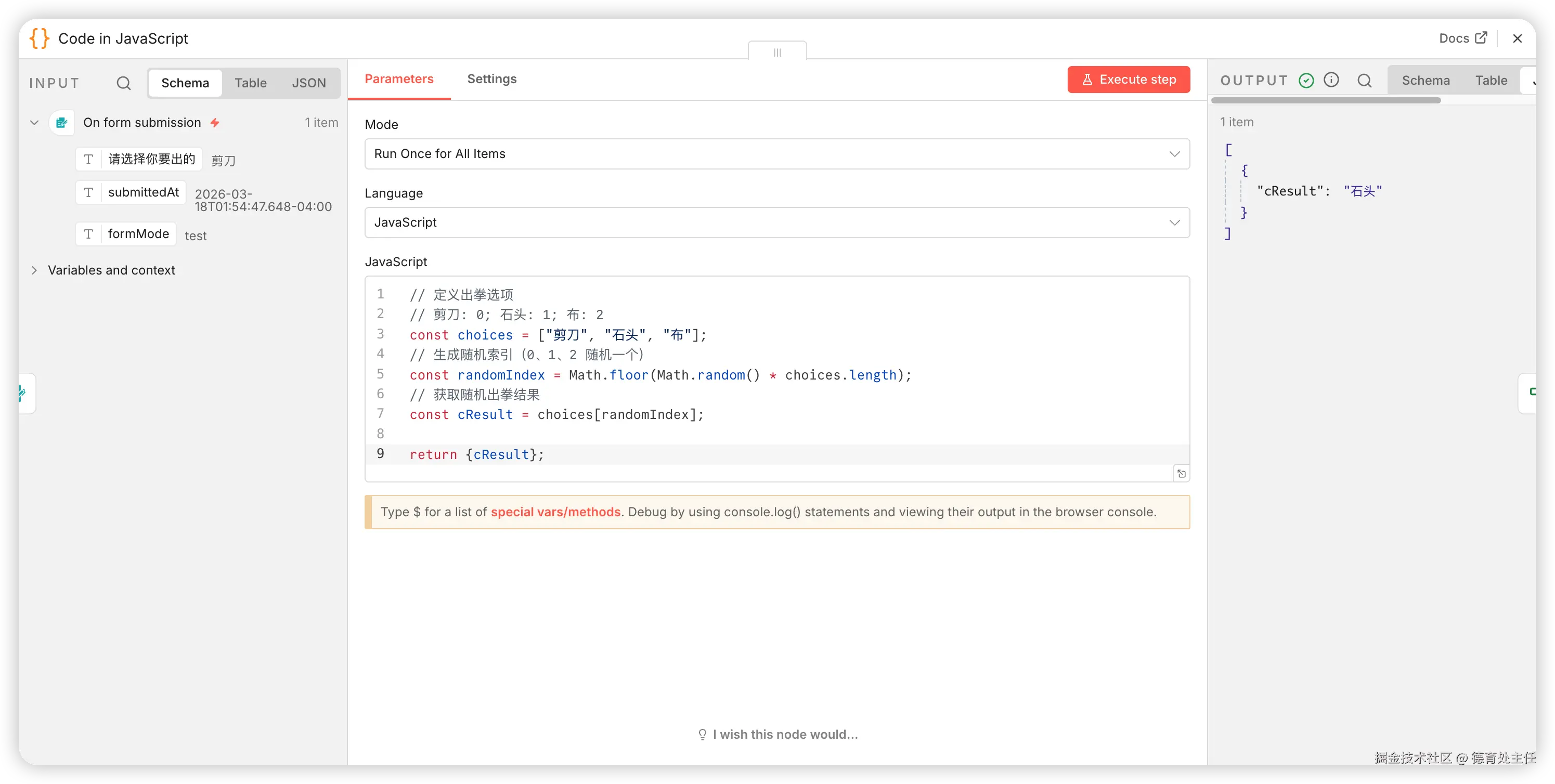 "jsCode": "console.log(`用户赢了。【用户:${$('On form submission').first().json['请选择你要出的']};电脑:${$('Code in JavaScript').first().json.cResult}】`)\n\nreturn {}"