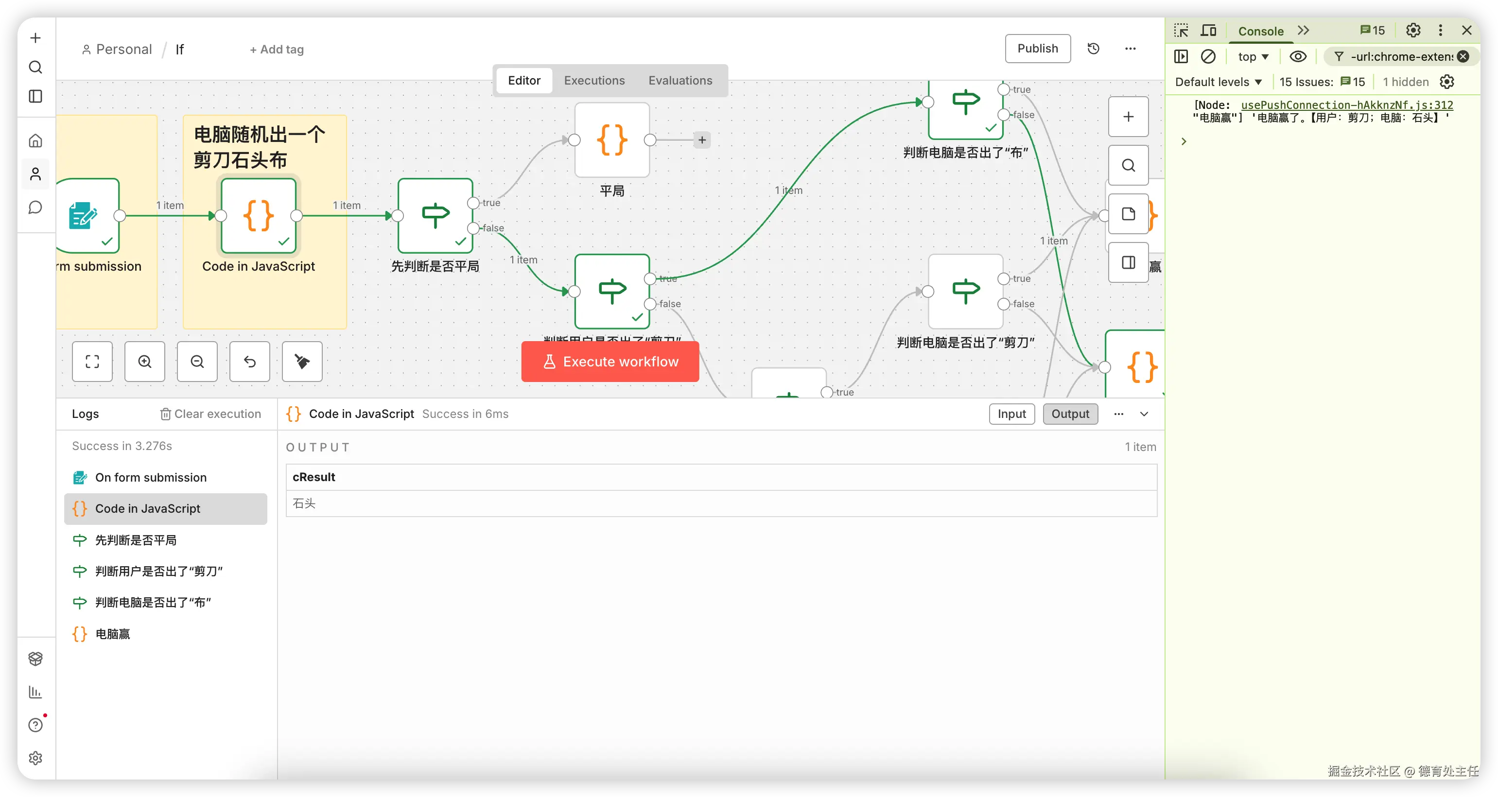 "jsCode": "console.log(`电脑赢了。【用户:${$('On form submission').first().json['请选择你要出的']};电脑:${$('Code in JavaScript').first().json.cResult}】`)\n\nreturn {}"