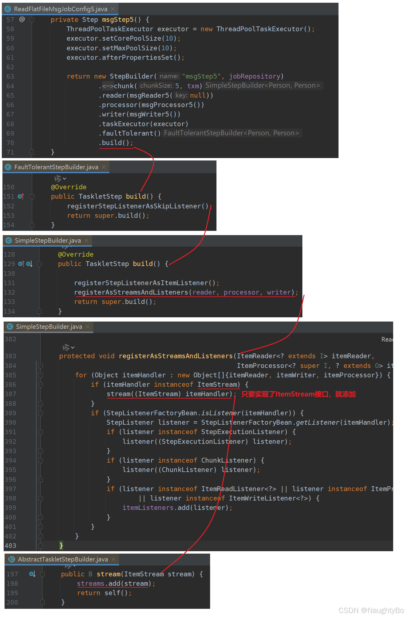 至于为什么要声明为ItemStream呢?因为@StepScope标记当前bean返回的是仅实现了ItemReader代理对象,判断时并不会认为它实现了ItemStream接口,因此默认就不会添加到streams中,所以必须显式声明为ItemStreamReader,如果需要动态写,同理可声明为IteamStreamWriter