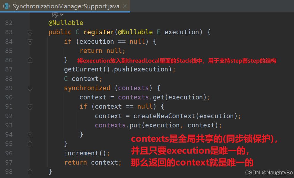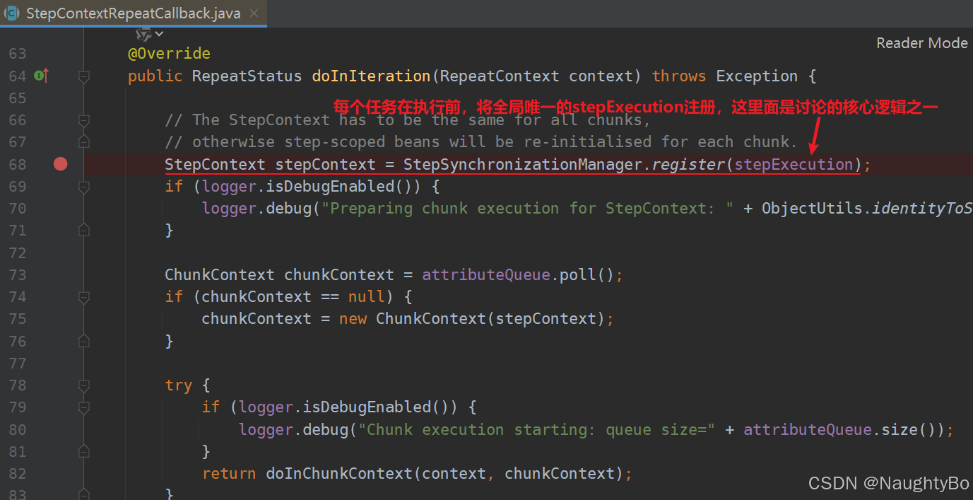 关键就在这里,只要stepExecution是唯一的,那么获取的stepContext就是同一个,那么如果一个step开了多线程去跑,那么肯定能保证stepExecution是同一个,那么stepContext就是所有线程所共享,那么执行step步骤的不同线程中获取的就是同一个stepContext。
