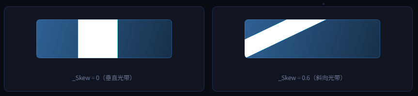 当 _Skew = 0 时光带垂直,_Skew = 0.5 时约 27°,_Skew = 1.0 时约 45°。