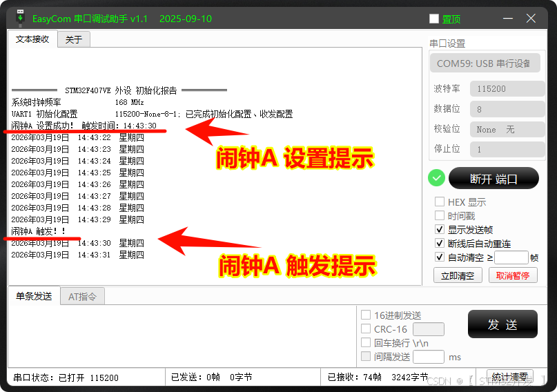烧录后,通过串口助手的调试信息,可以看到 闹钟A 按指定的"时分秒"触发。
