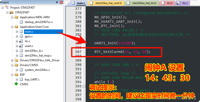 至此,CubeMX 对 RTC 闹钟的配置已完成,接下来进入应用层代码编写。