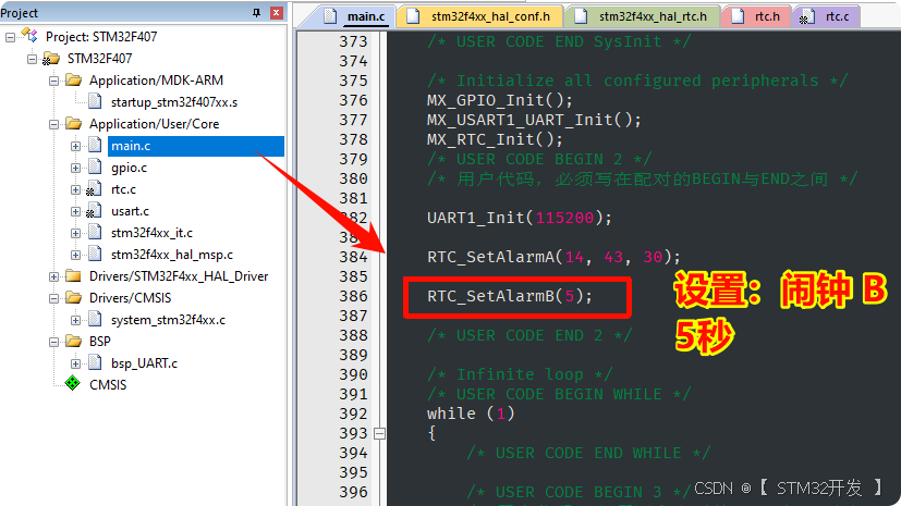 - 在刚才RTC_SetAlarmA()函数的下方。