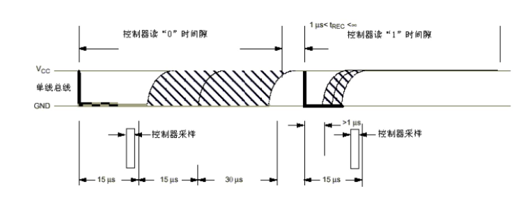 | 4. 主机在释放后 15us 内采样 DQ:高=1,低=0 |