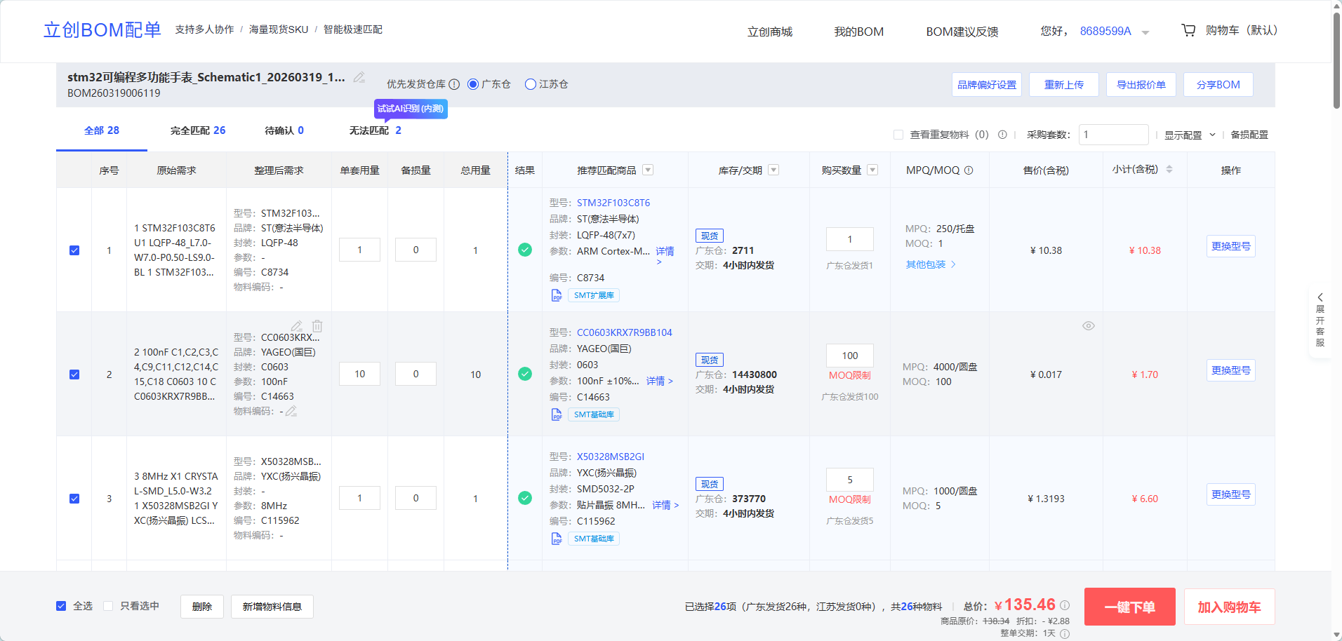 原理图直接可以把所需要的物料导入到立创下单,总的价格还是挺贵的。我只选了一套的物料就一百多了。多的话可以均摊成本。