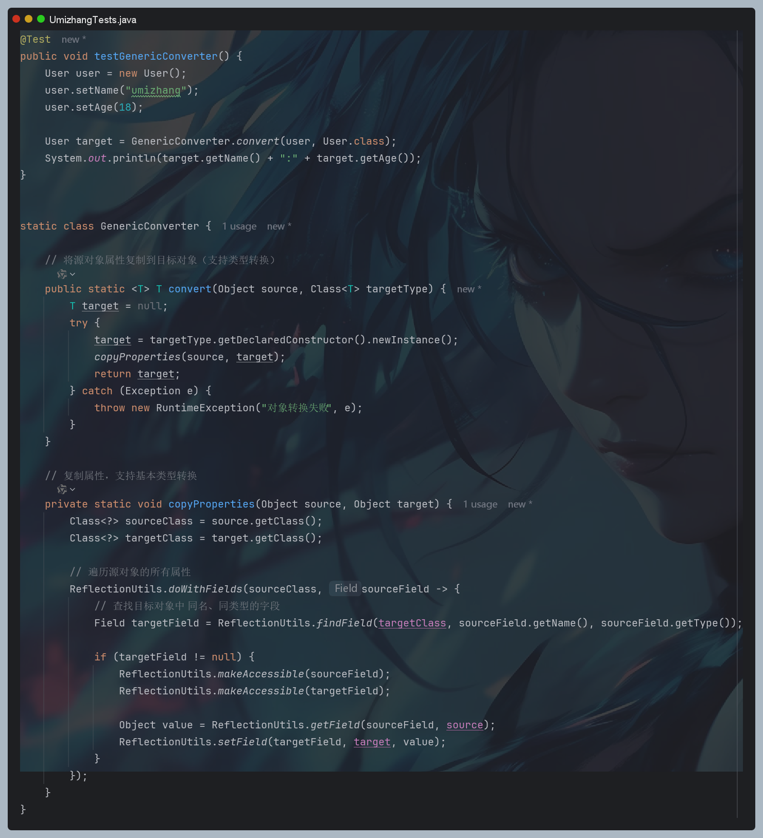 最后,让我们用ReflectionUtils实现一个实用的功能:通用的DTO转换器,将任意两个对象的同名属性进行拷贝(比BeanUtils更灵活,支持类型转换)。