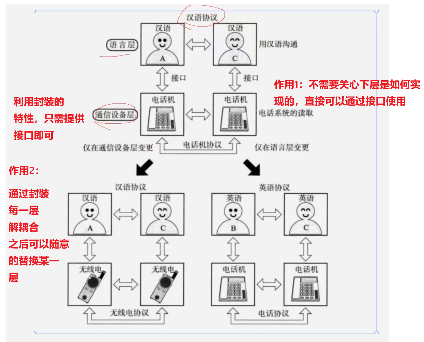 在网络通信过程中十分复杂,如果设计一个协议,得解决很多问题,导致这个协议可能变的十分庞大且复杂。于是可以把这个大的协议拆成多份多份功能单一的小协议,在把这些小协议归类(即分层),只有相邻的两层协议可以进行交互,上层调用下层,下层提供服务。但协议层之间的交互不能跨层进行。