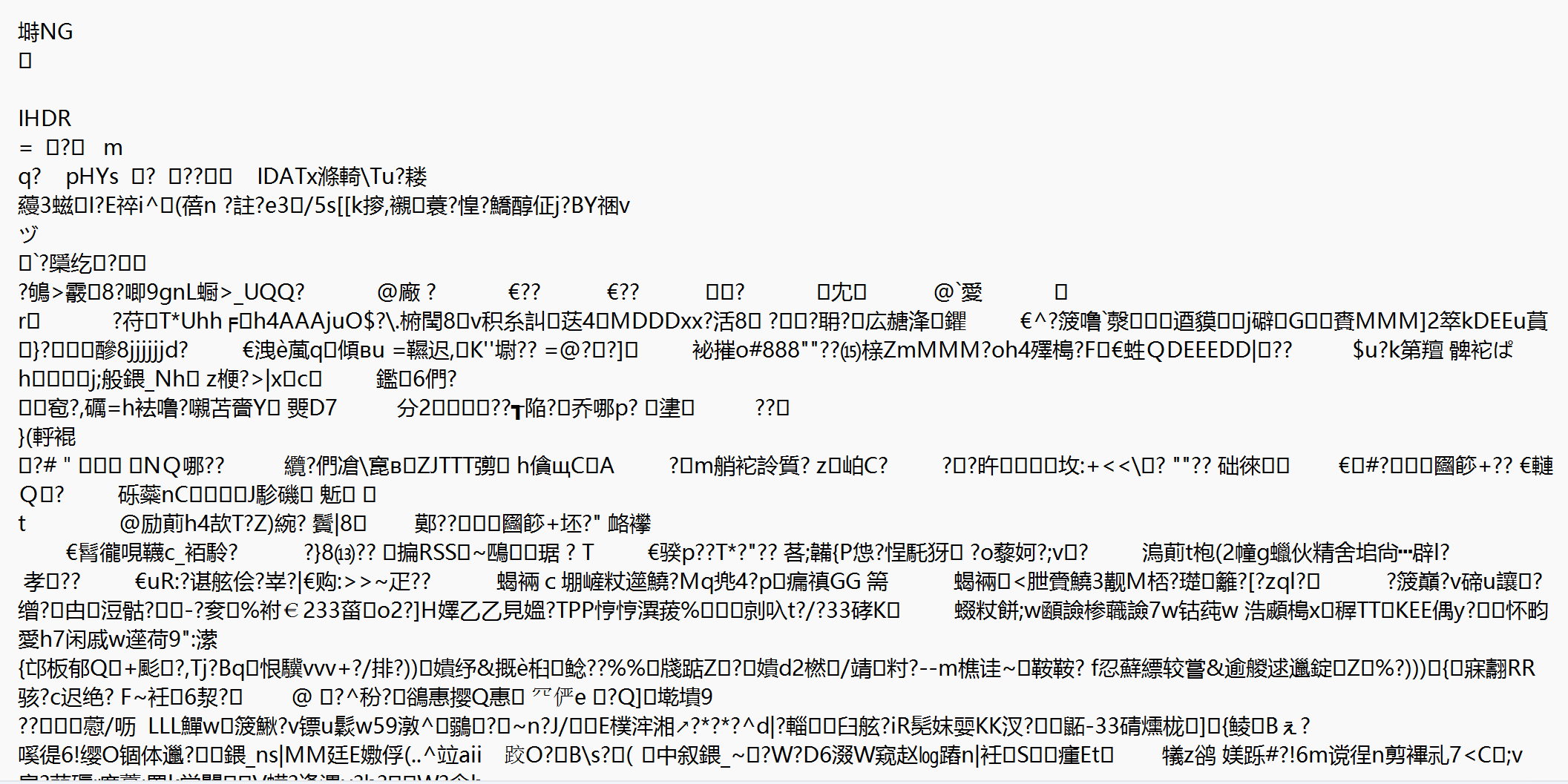 - 这两种文件很好区分,我们用记事本打开文件,发现没一点规律的就是"二进制文件"无疑了,因为二进制文件本来就不是给人看的,是给机器看的。典型的二进制文件就是图片(视频等):(出现中文等字符,是记事本尝试按字符集编码二进制文件,而导致的乱码)