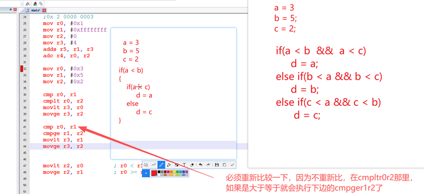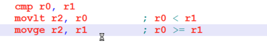 比如我想判断r0和r1的大小然后把数据填入r2中,把条件码写到mov后即可: