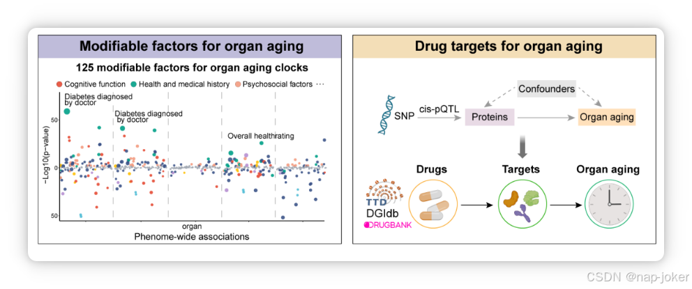 通过孟德尔随机化识别出14个潜在药物靶点,如TIE1与脑衰老、UMOD与肾脏衰老,部分已在临床研究中被探索。